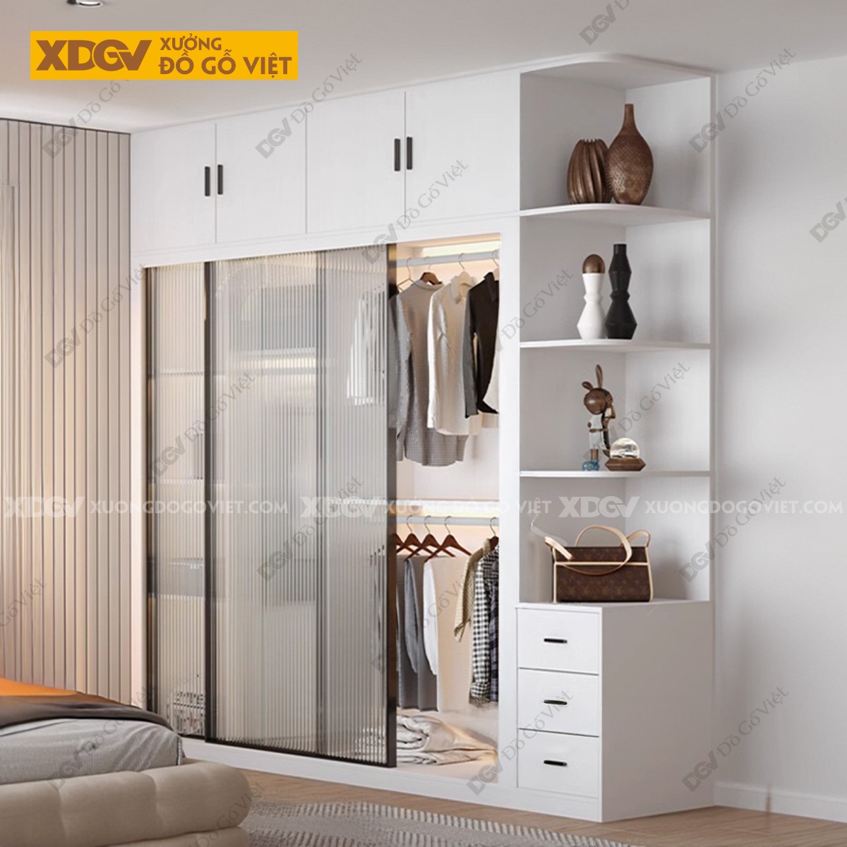 Tủ Áo MDF Màu Trắng Kịch Trần Tay Âm Kết Hợp Kệ Trang Trí