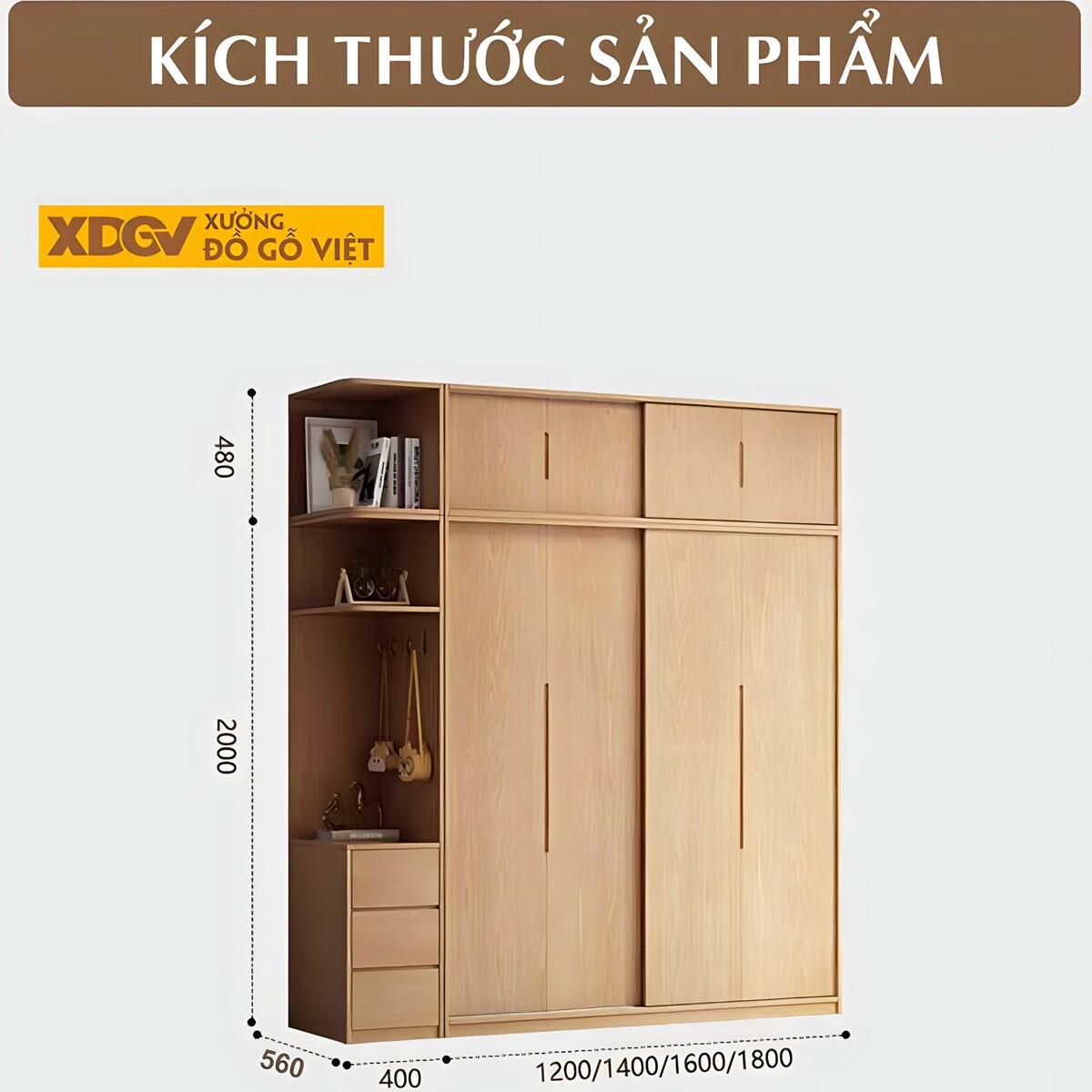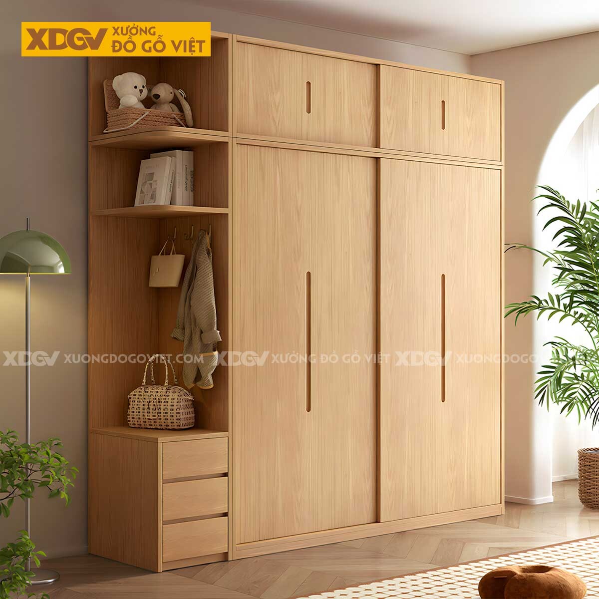Tủ Quần Áo Gỗ Veneer Sồi Cửa Lùa Thêm Ngăn Nóc Và Kệ Bên