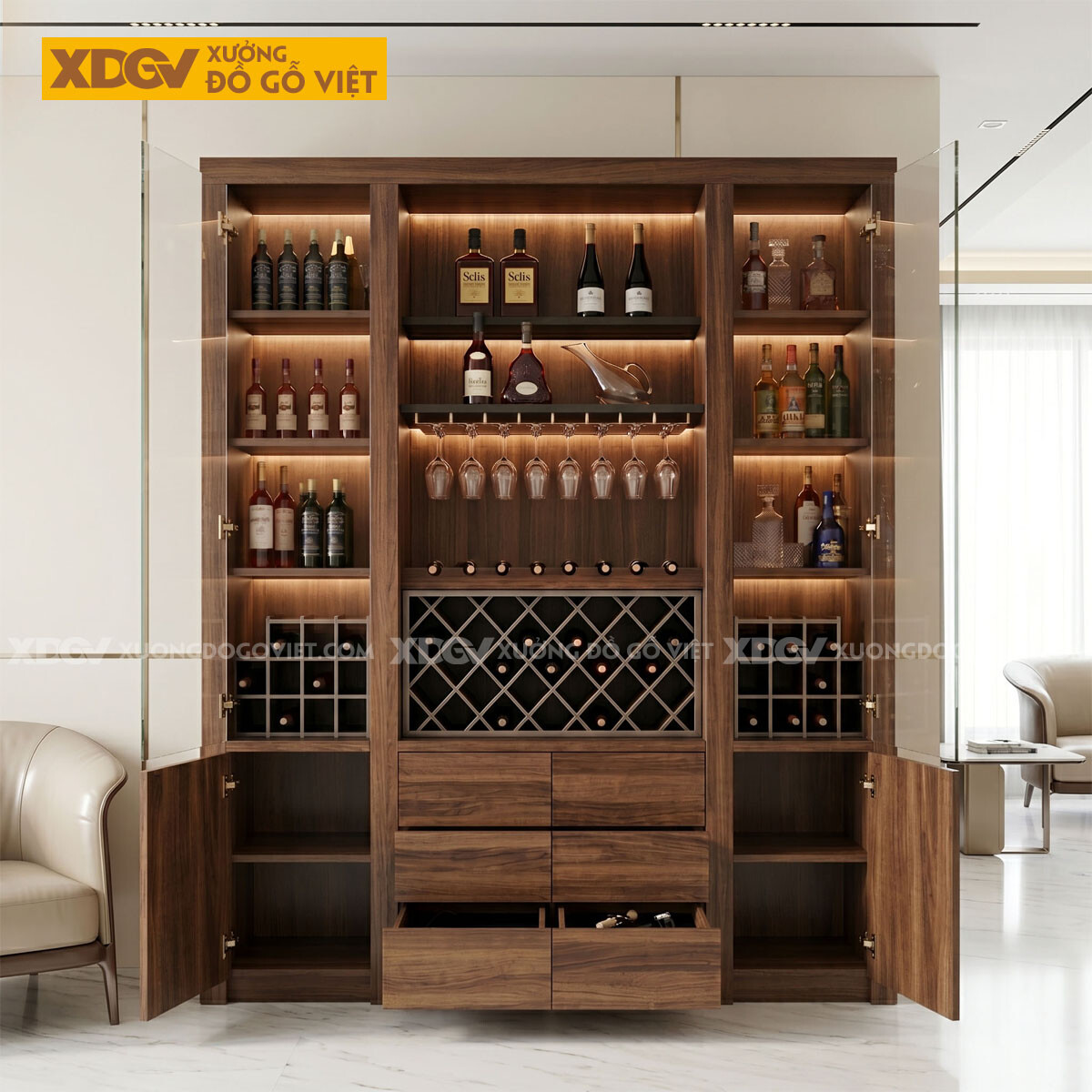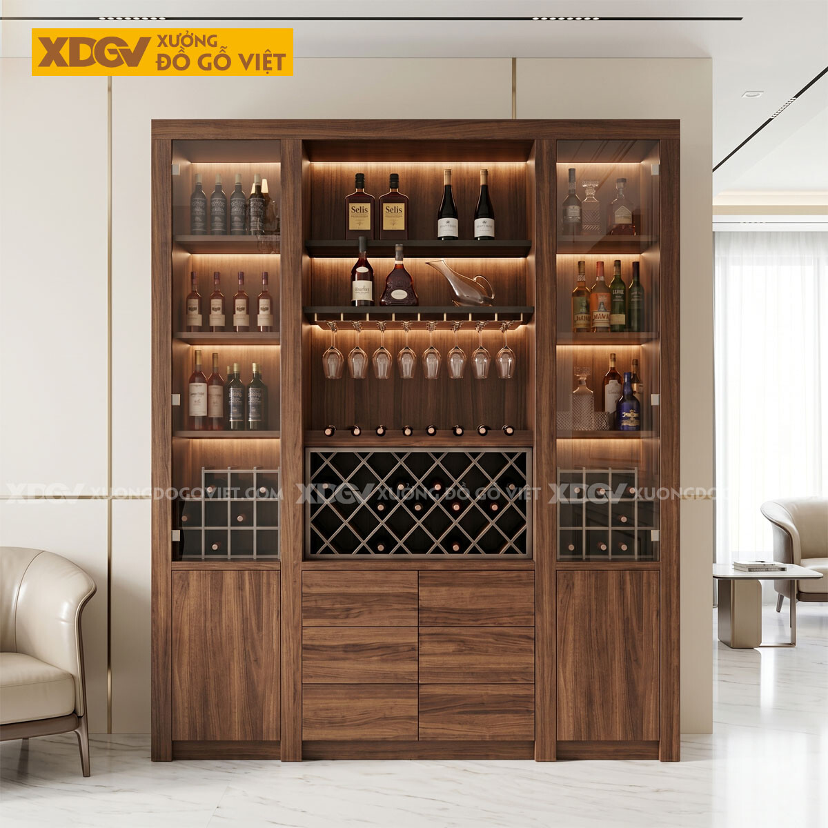 Tủ Rượu Gỗ Óc Chó Phối Ô Đựng Rượu Kèm Ngăn Kéo Trung Tâm