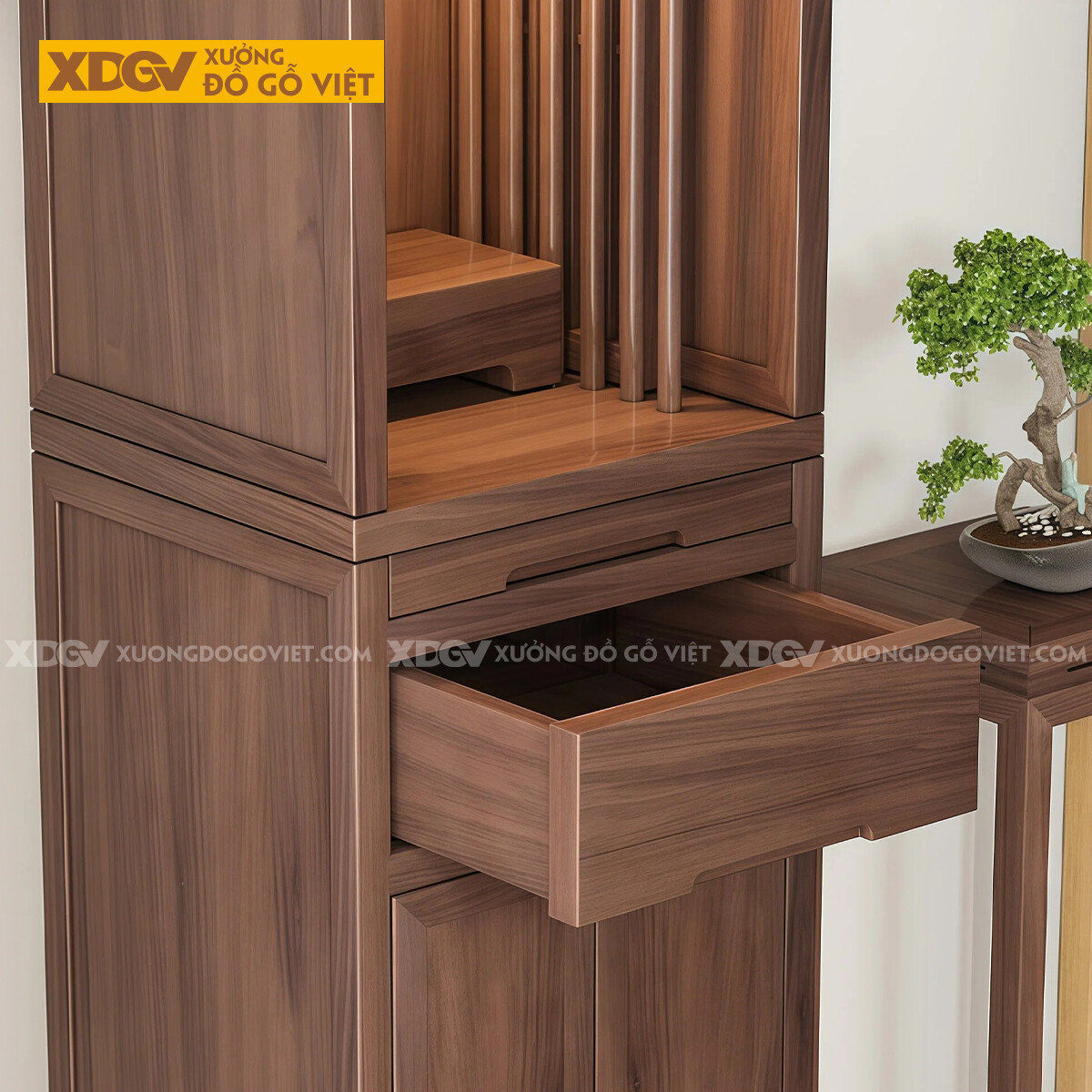 Mẫu Bàn Thờ Tôn Nghiêm Gỗ Óc Chó Phân 2 Tầng Phối Ngăn Kéo