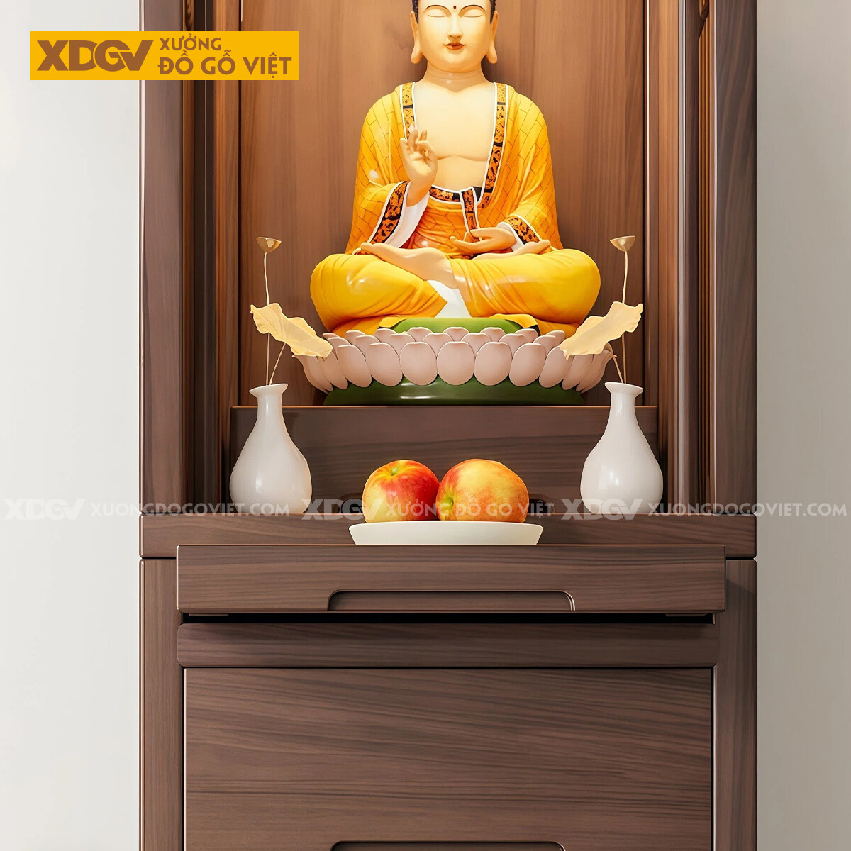 Mẫu Tủ Thờ Gỗ Óc Chó Kèm Ngăn Kéo Và Tai Cong Chạm Nhẹ 2 Bên